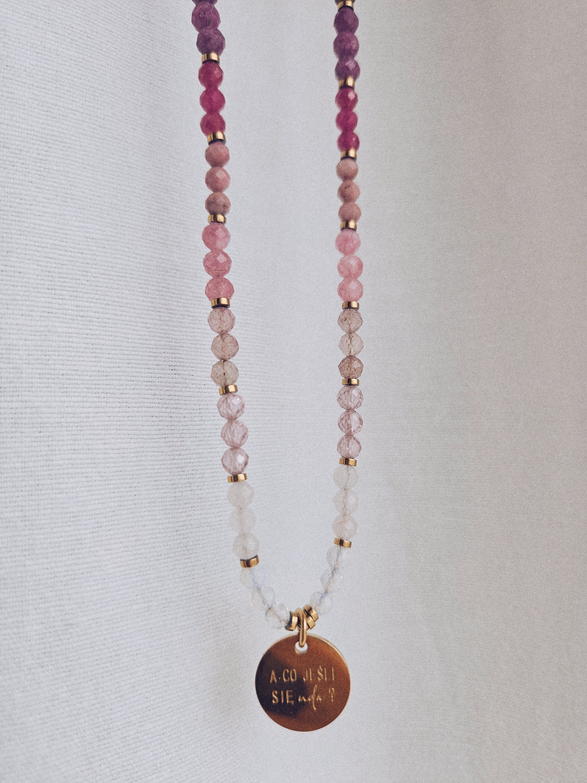 Ten naszyjnik to opowieść o drodze duszy — od cienia po pełnię światła. Łączy głęboką energię ochrony i odwagi z delikatnością miłości i duchowego przebudzenia. Czarny turmalin, kianit i rubin tworzą podstawę siły i mocy, a kwarc arbuzowy, rodonit, różowy kwarc, kryształ górski i opal unoszą wibrację ku zaufaniu, miłości i wewnętrznemu światłu.