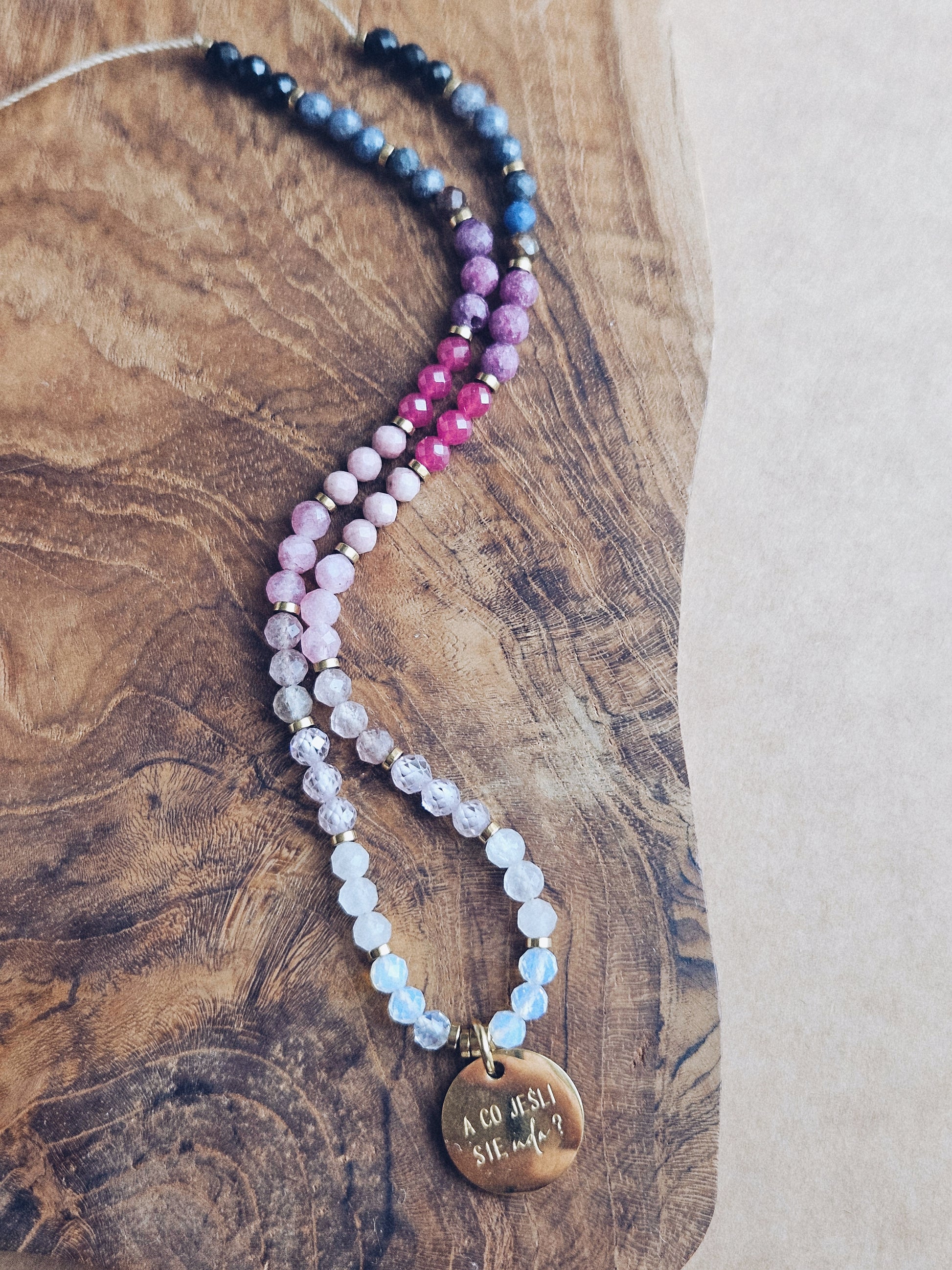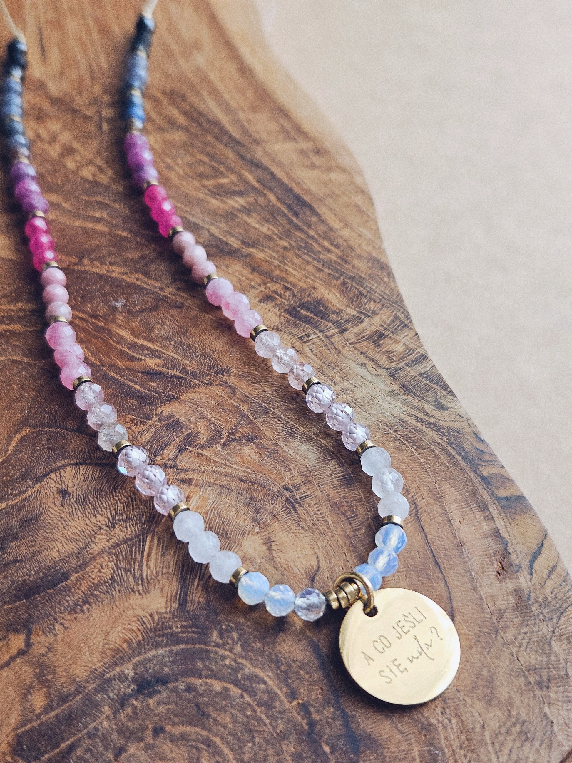 Naszyjnik z Kamieni Naturalnych: Czarny Turmalin, Kianit, Rubin, Kwarc Arbuzowy, Rodonit, Kwarc Różowy, Kryształ Górski i Opal z Zawieszką „A co jeśli się uda?”