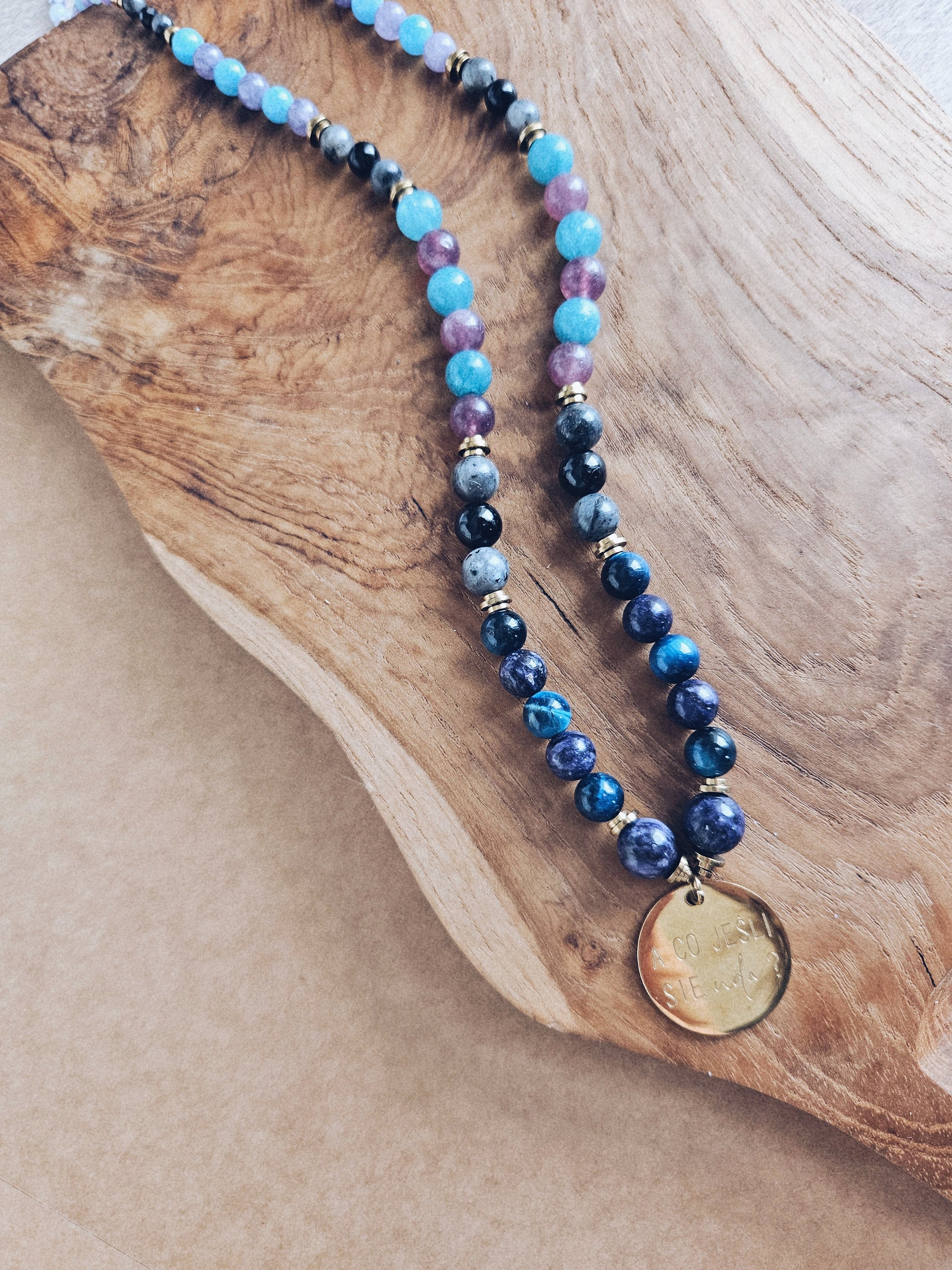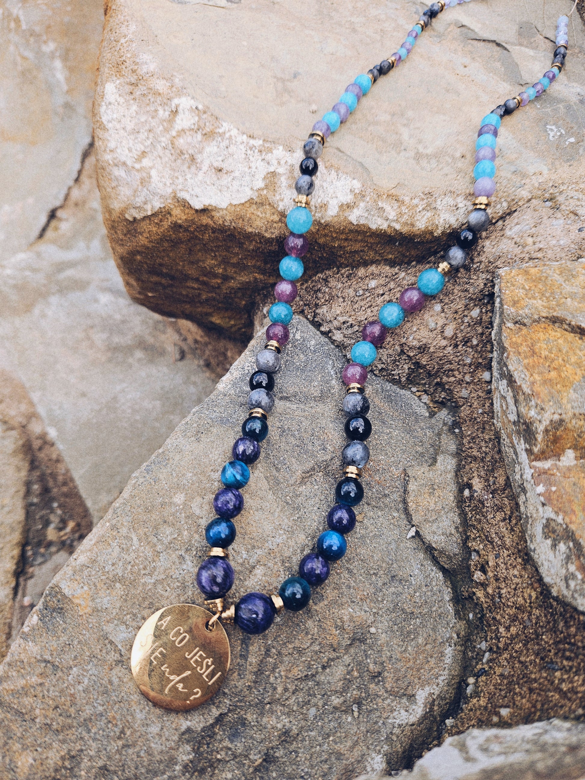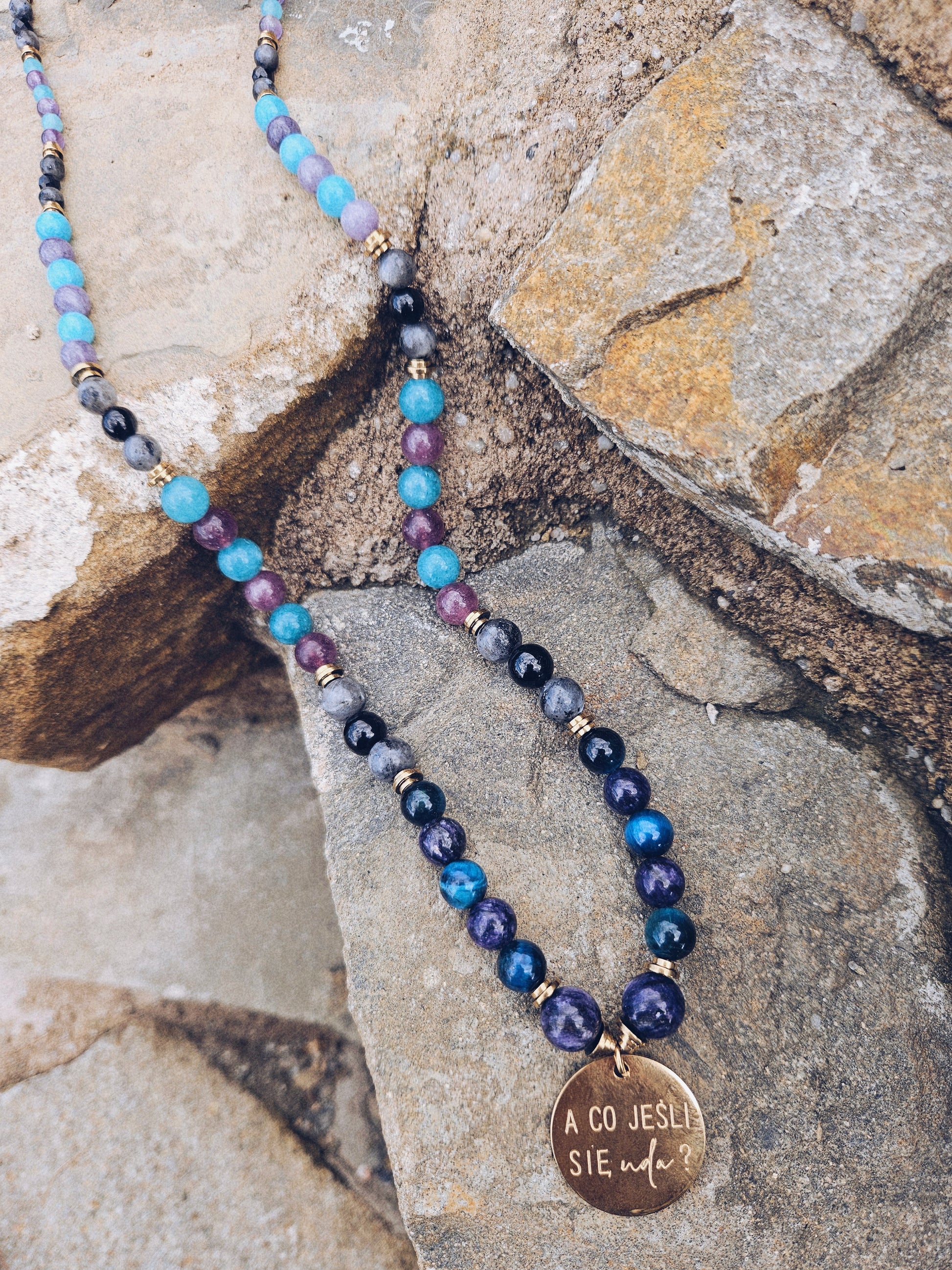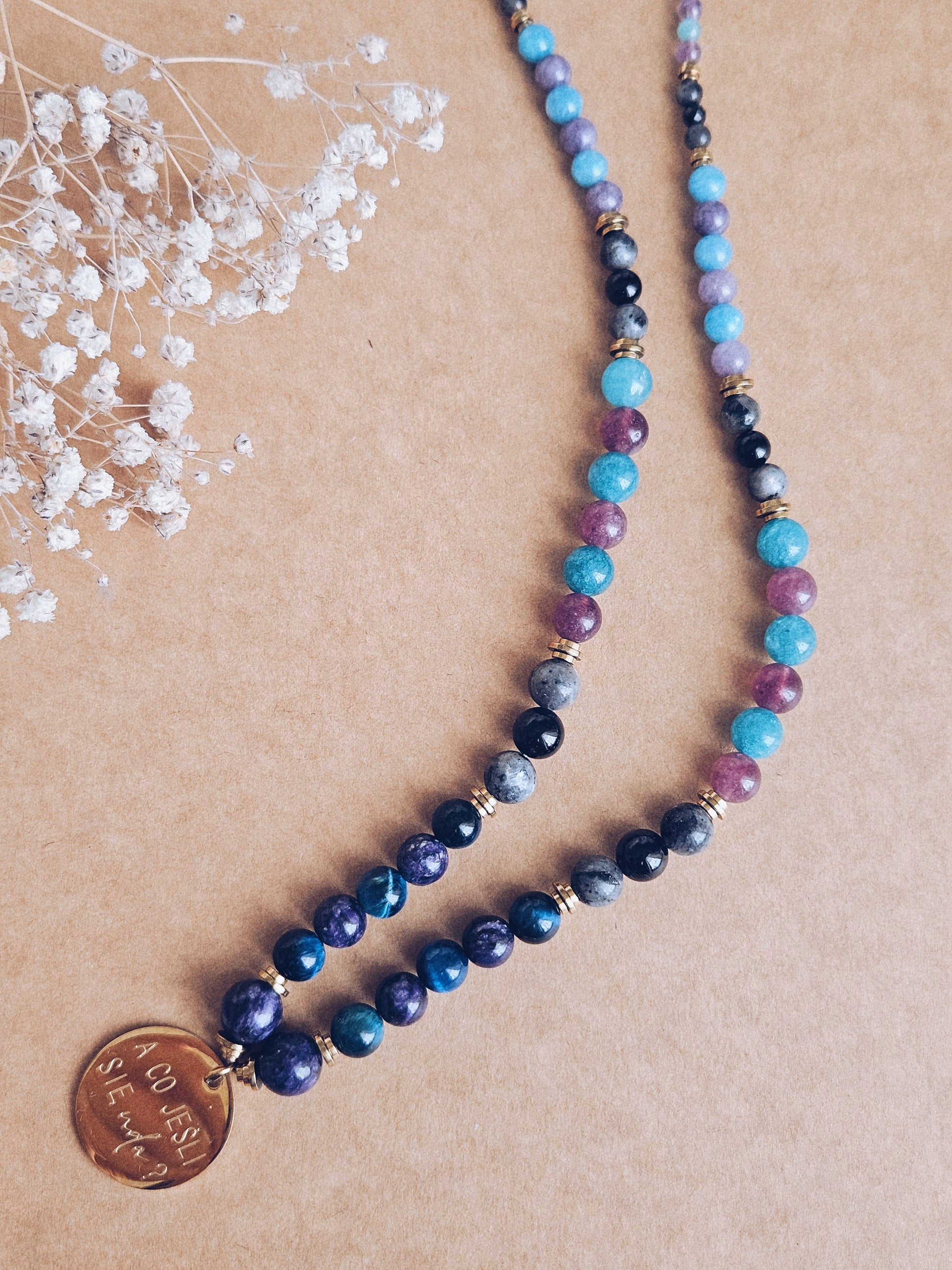 Naszyjnik z Kamieni Naturalnych: Czaroit, Lapis Lazuli, Apatyt, Ametyst, Kianit i Turmalin z Zawieszką z Grawerem „A co jeśli się uda?”