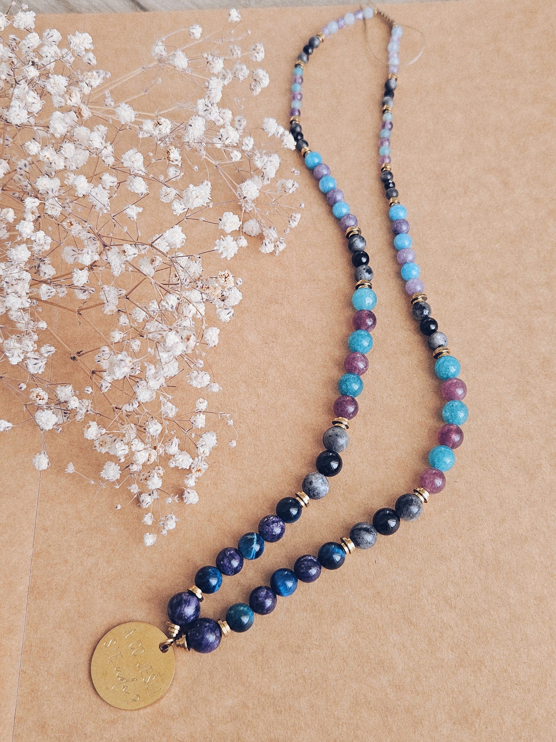 Naszyjnik łączący czaroit, lapis lazuli, apatyt, ametyst, kianit i turmalin to kompozycja energii odwagi, harmonii i duchowej mocy.